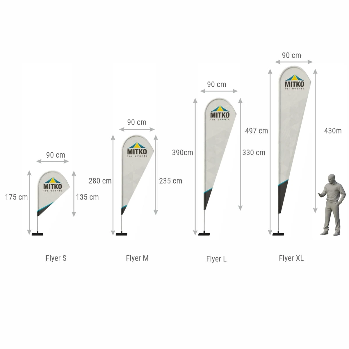 To właśnie wśród flag Flyer znajdują się modele w najmniejszym i największym rozmiarze – flaga Flyer S (135 cm) i flaga Flyer XL (430 cm). Jeśli potrzebujesz większej ilości flag Flyer L, zobacz zestaw 8 flag Flyer L.