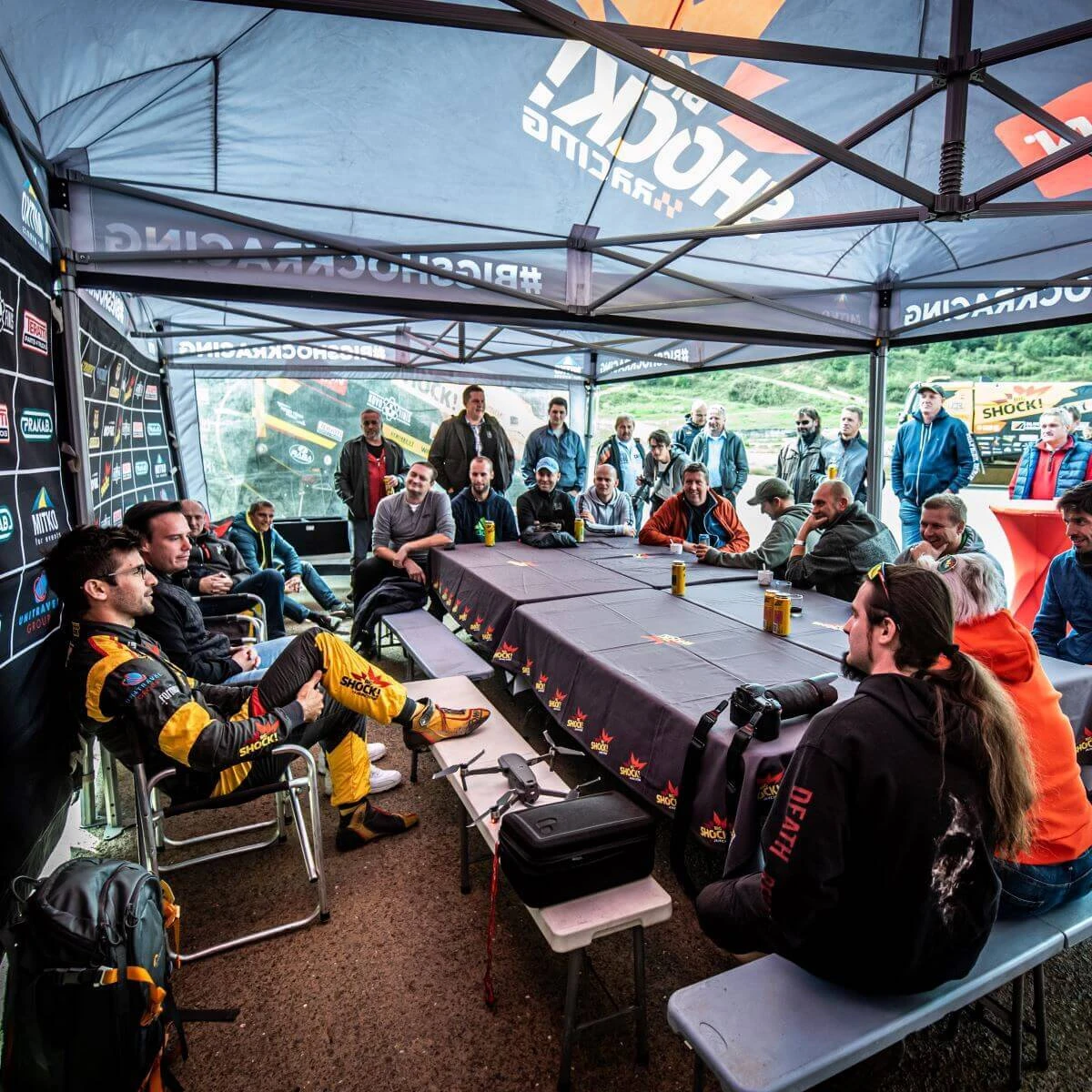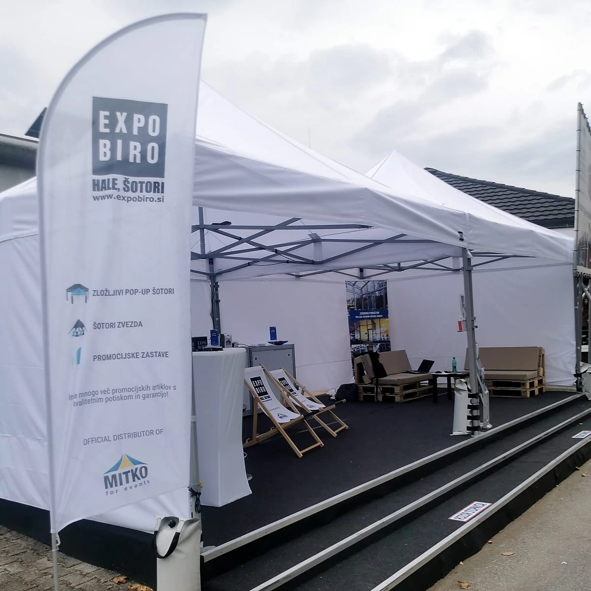 Używamy odpornej na uszkodzenia, gęsto tkanej tkaniny poliestrowej o gramaturze 240 g/m2. Tkanina jest podwójnie impregnowana, a szwy są uszczelniane taśmą, która zapobiega przeciekaniu. Montaż ścian jest możliwy dzięki mocnym 5 cm rzepom, doszytym od wewnątrz do falban dachu.