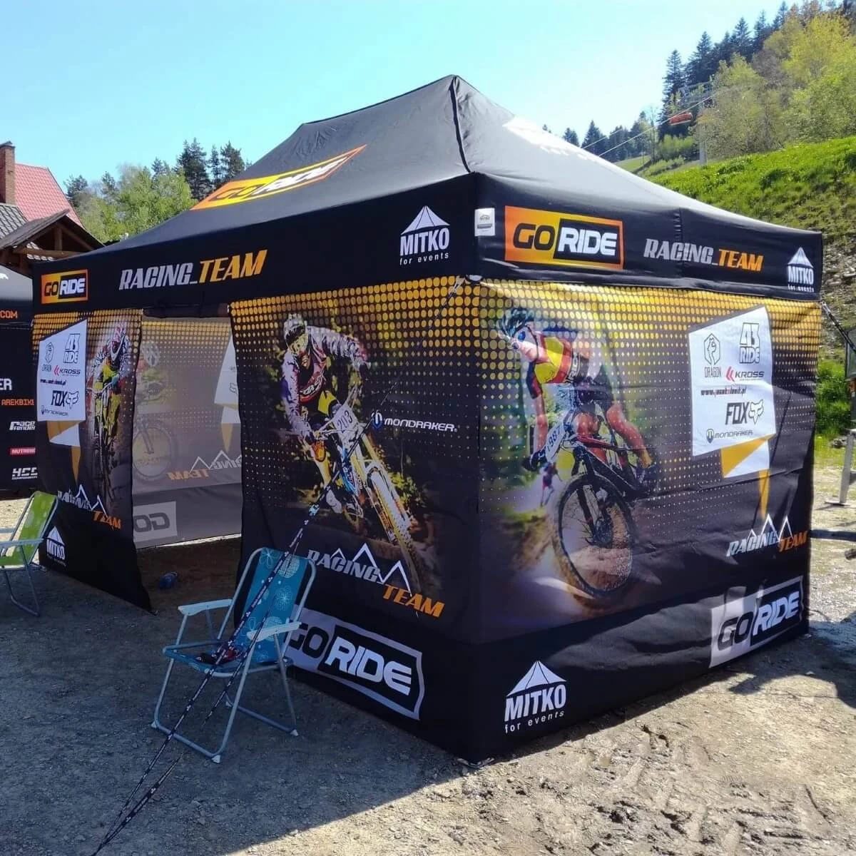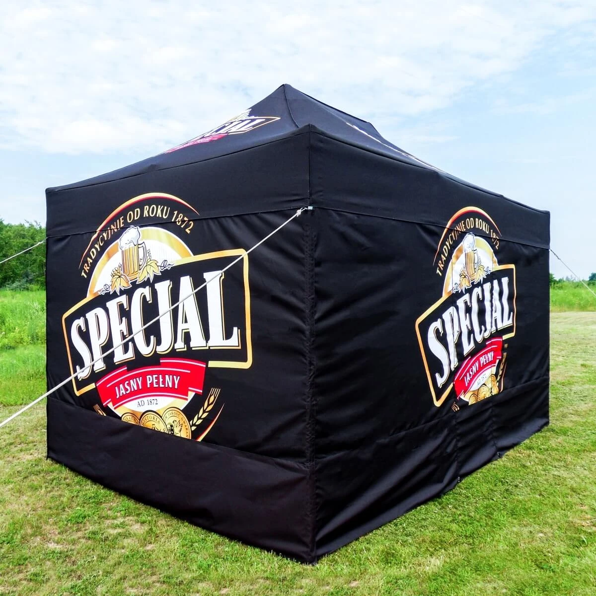Namiot ekspresowy z oryginalną grafiką już z daleka przyciąga uwagę gości eventu. Wykorzystaj ten fakt i umieść na namiocie 3x4,5 m dowolny nadruk reklamowy.