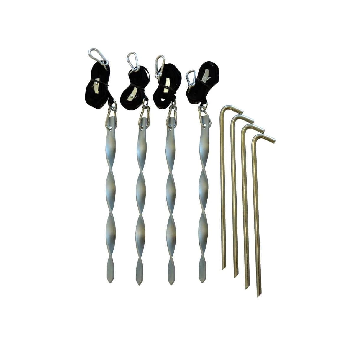 - Skrętne kotwy z regulowanymi taśmami odciągowymi, by zabezpieczyć namiot przed wiatrem.