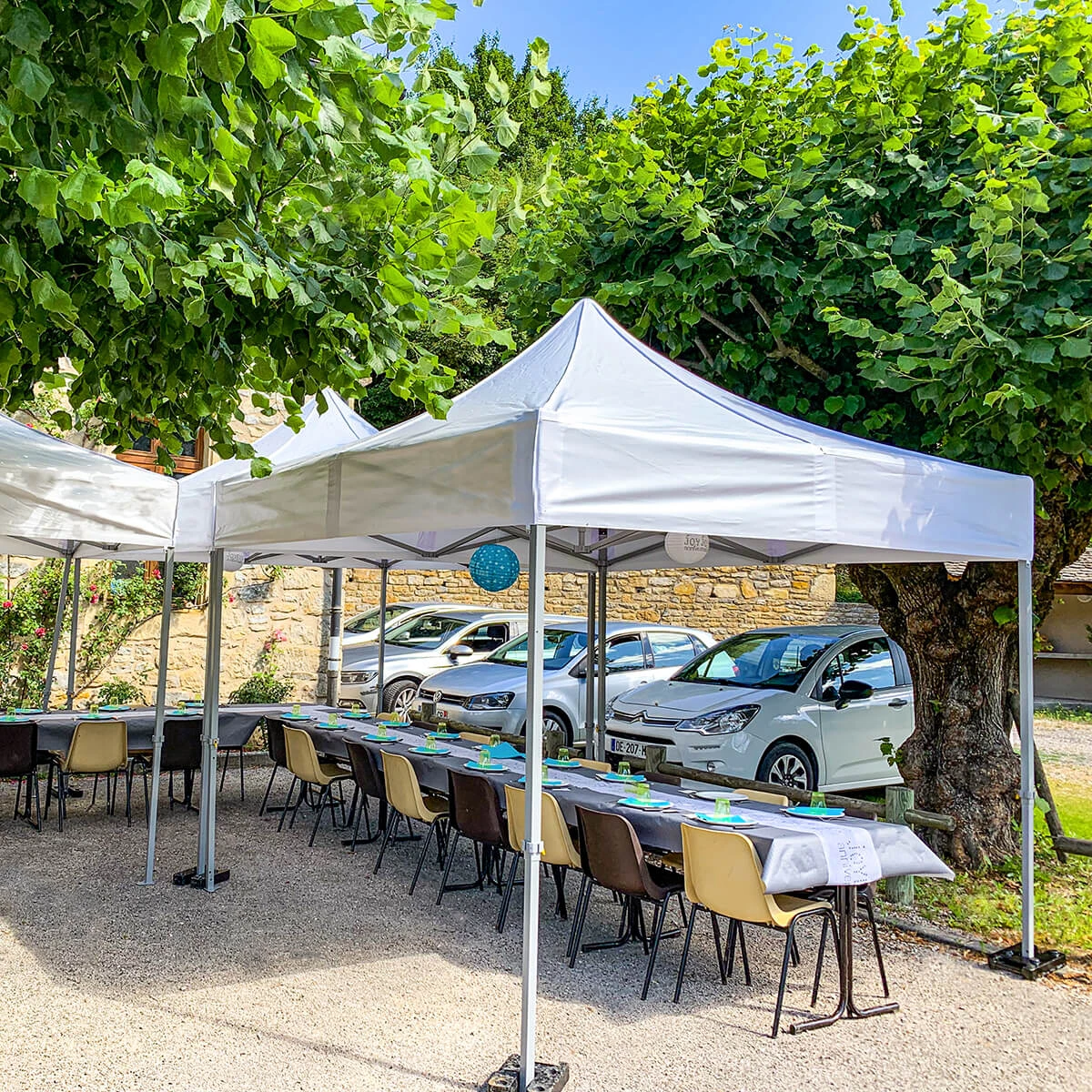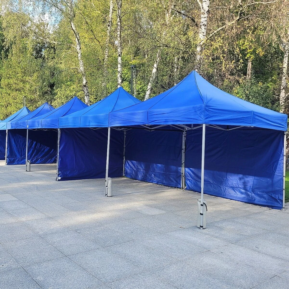 Używamy odpornych na uszkodzenia, gęsto tkanych tkanin poliestrowych. Tkaniny są impregnowane, a szwy są uszczelniane taśmą, która zapobiega przeciekaniu. Montaż ścian jest możliwy dzięki mocnym 5 cm rzepom, doszytym od wewnątrz do falban dachu.
