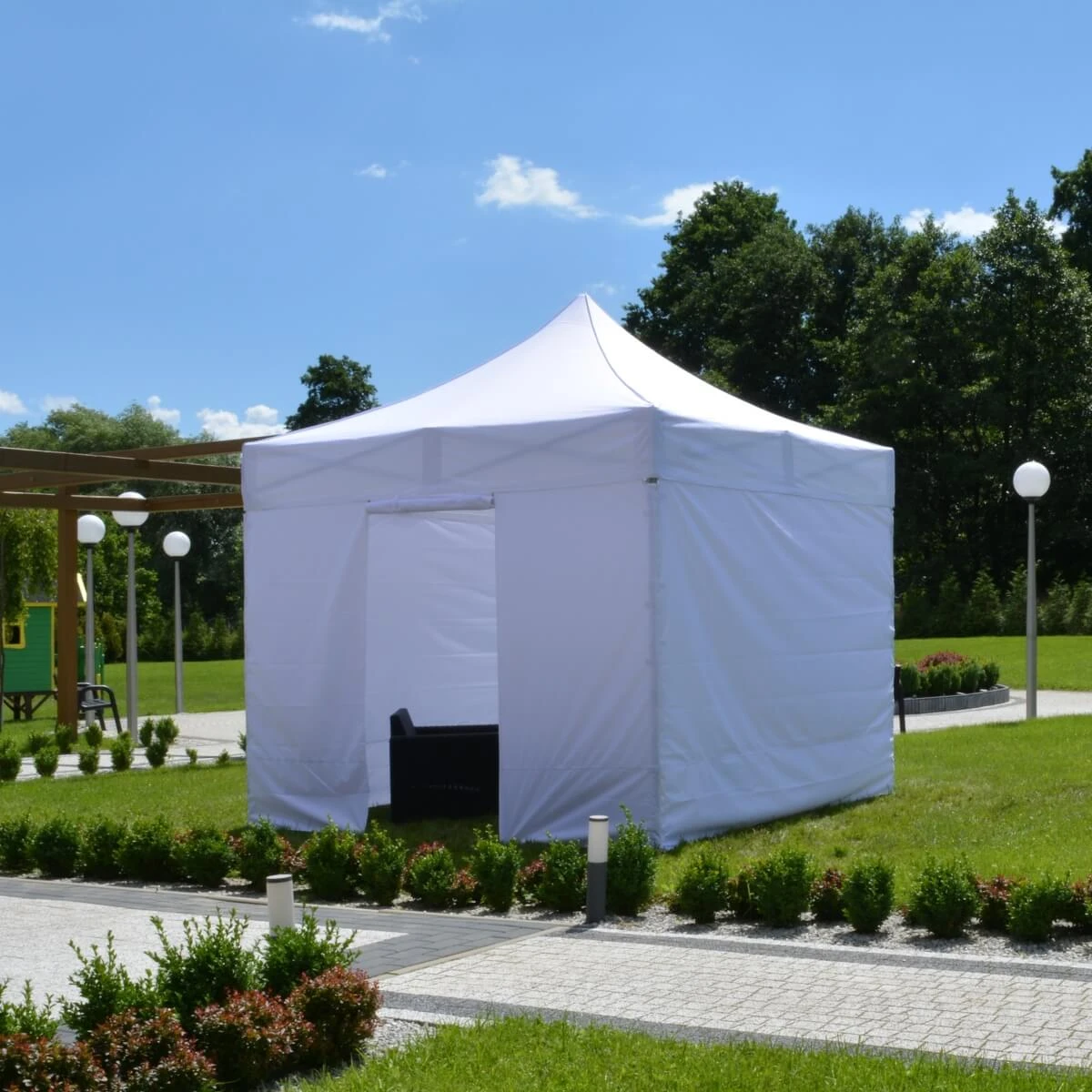 Jeśli Twój namiot ma pełnić wyłącznie funkcję użytkową, wersja konstrukcji z niezadrukowanym dachem jest propozycją dla Ciebie. Taki namiot ekspresowy sprawdzi się wszędzie tam, gdzie potrzebne jest zadaszenie wybranej przestrzeni.