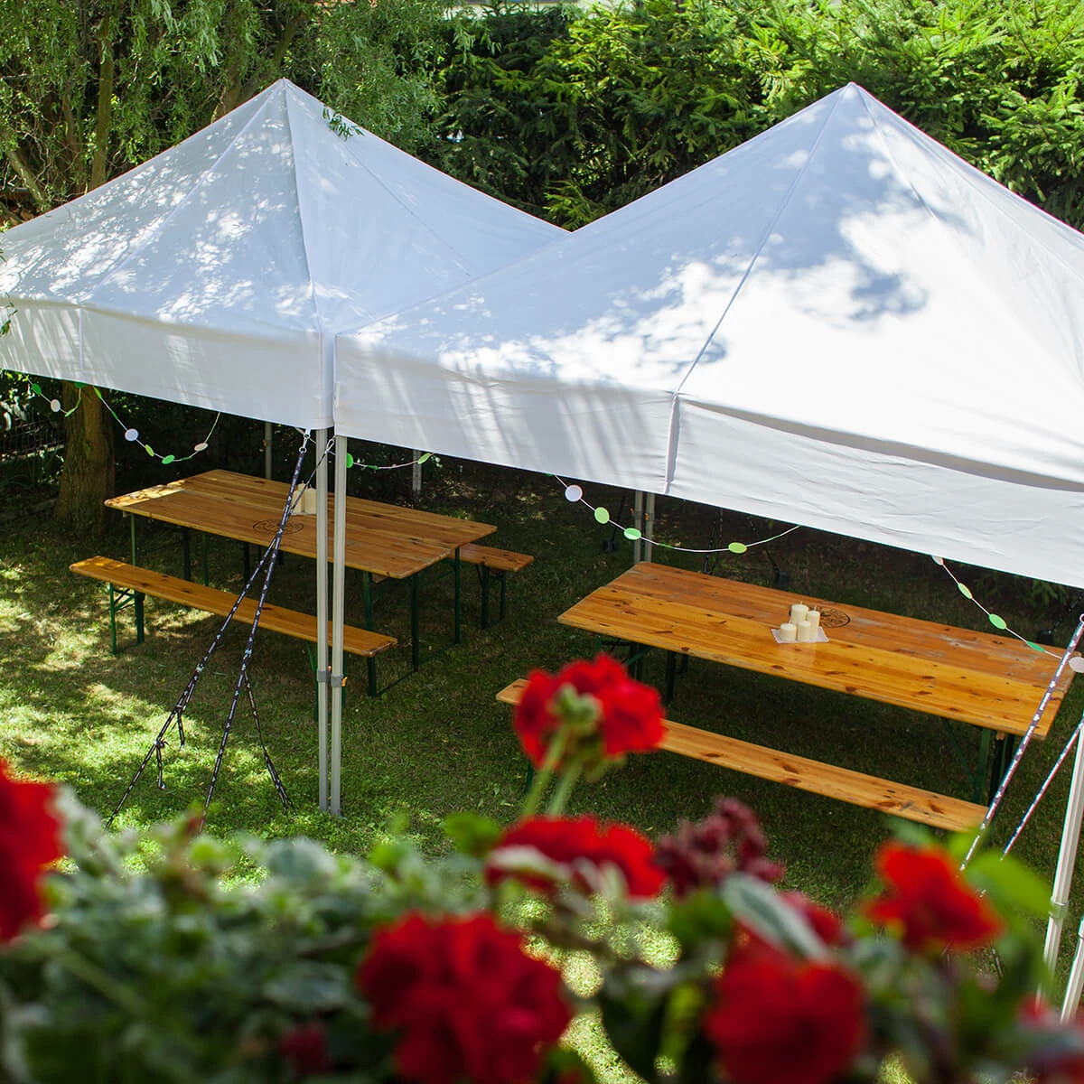 Używamy odpornych na uszkodzenia, gęsto tkanych tkanin poliestrowych. Tkaniny są impregnowane, a szwy są uszczelniane taśmą, która zapobiega przeciekaniu. Montaż ścian jest możliwy dzięki mocnym 5 cm rzepom, doszytym od wewnątrz do falban dachu.