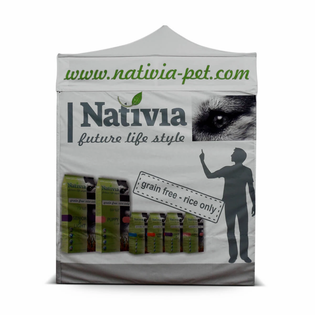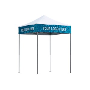 Namiot ekspresowy 2x2 w wersji bez ścian, z nadrukiem na falbanach - to opcja stworzona z myślą o klientach lubiących minimalizm. Jednolity dach w połączeniu z logotypem i nazwą firmy umieszczonymi na falbanach stanowią subtelne obrandowanie namiotu. To dobry sposób na zaprezentowanie marki podczas eventów.