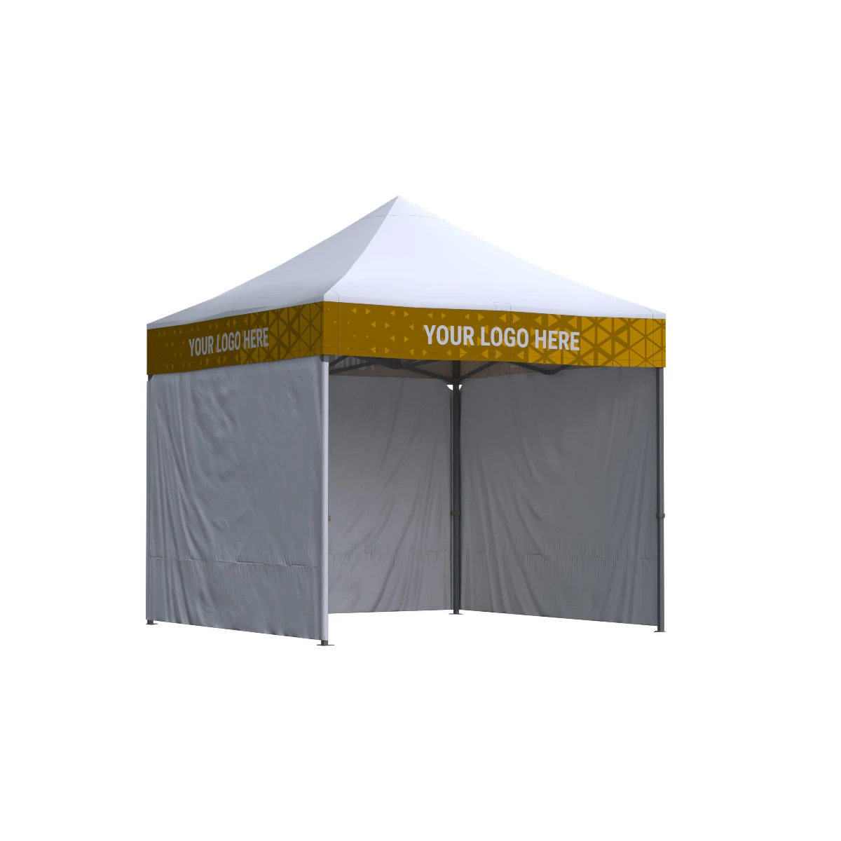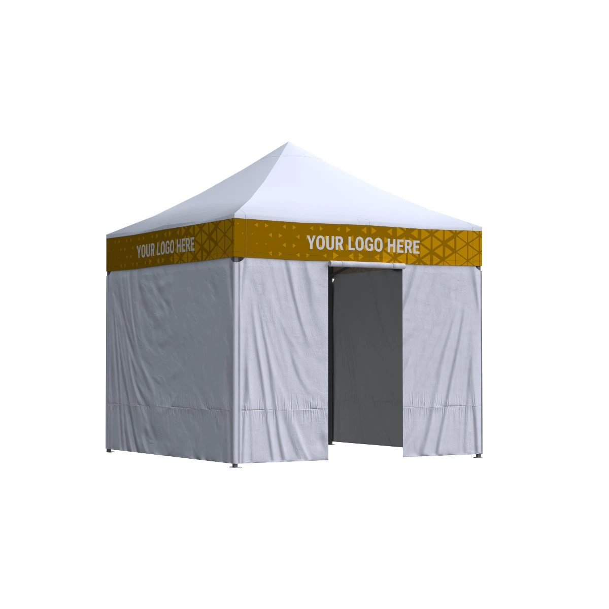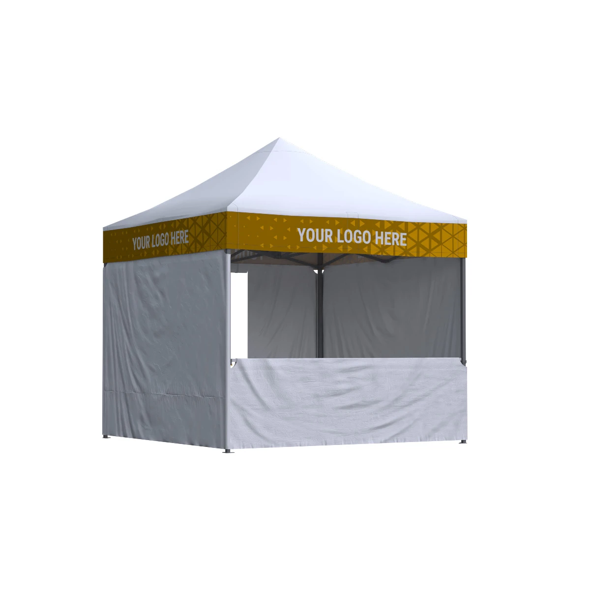 Falbany z nadrukiem podkreślają identyfikację wizualną marki, a zamknięta konstrukcja zapewnia skuteczną ochronę przestrzeni eventowej przed warunkami atmosferycznymi.