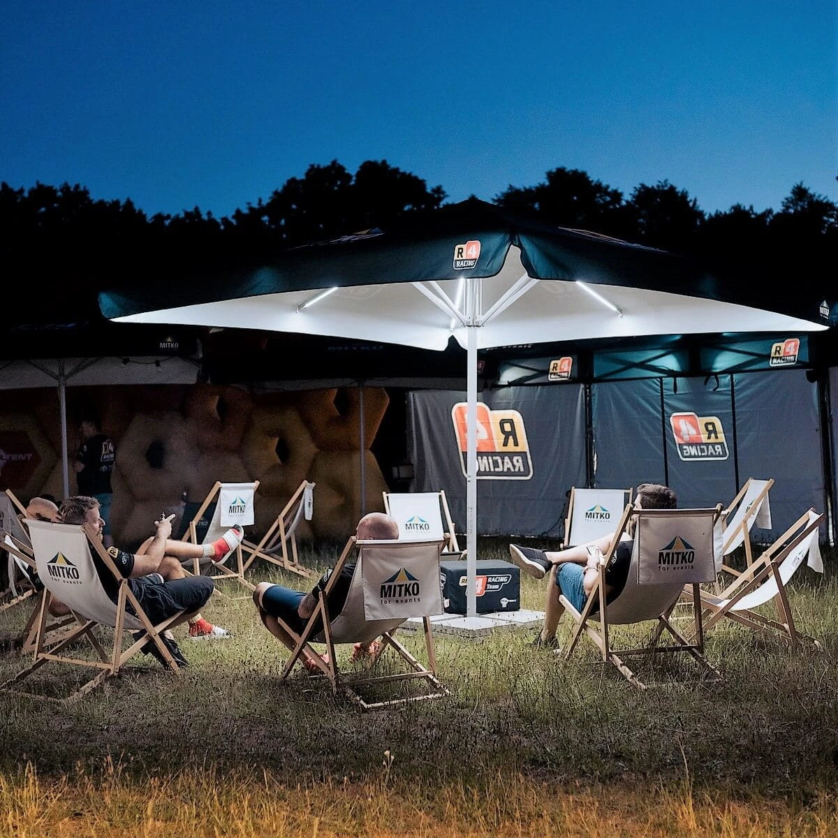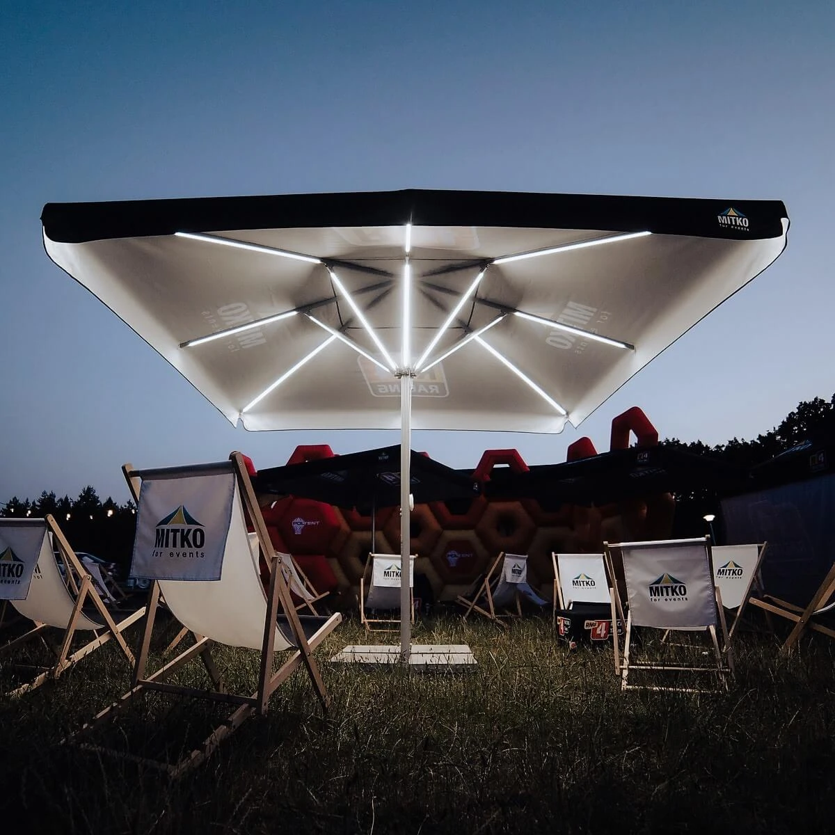 Kwadratowy parasol reklamowy z wbudowanym w konstrukcję oświetleniem LED – czy może być coś, co lepiej wyróżni Cię spośród konkurencji na evencie? Nie powielaj gotowych rozwiązań. Jeśli wszyscy wybierają okrągłe parasole, Ty wybierz kwadratowy. Jeśli inni wyróżniają się ciekawym sloganem reklamowym, Ty przyćmij ich blaskiem konstrukcji.